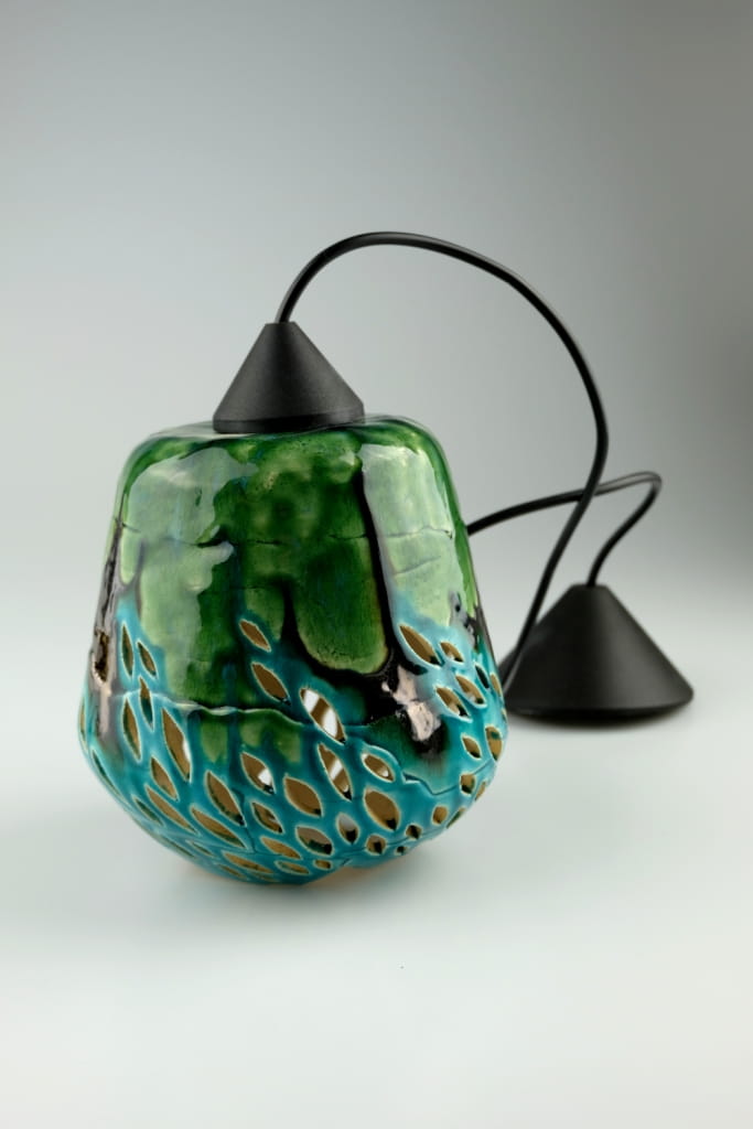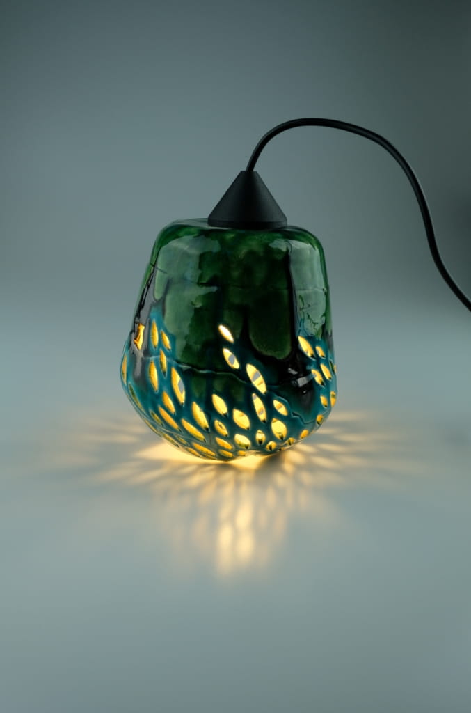 Ceramiczna lampa do zawieszenia. Ręcznie wykonana z wysokiej jakości materiałów ceramicznych. Oryginalna i elegancka w swojej formie, z delikatnym ażurem, poprzez który wydostające się światło, budując klimat pomieszczania. Pokryta wyjątkową paletą kolorów szkliw: transparentnym turkusem, soczystą zielenią i płynącym złotem.